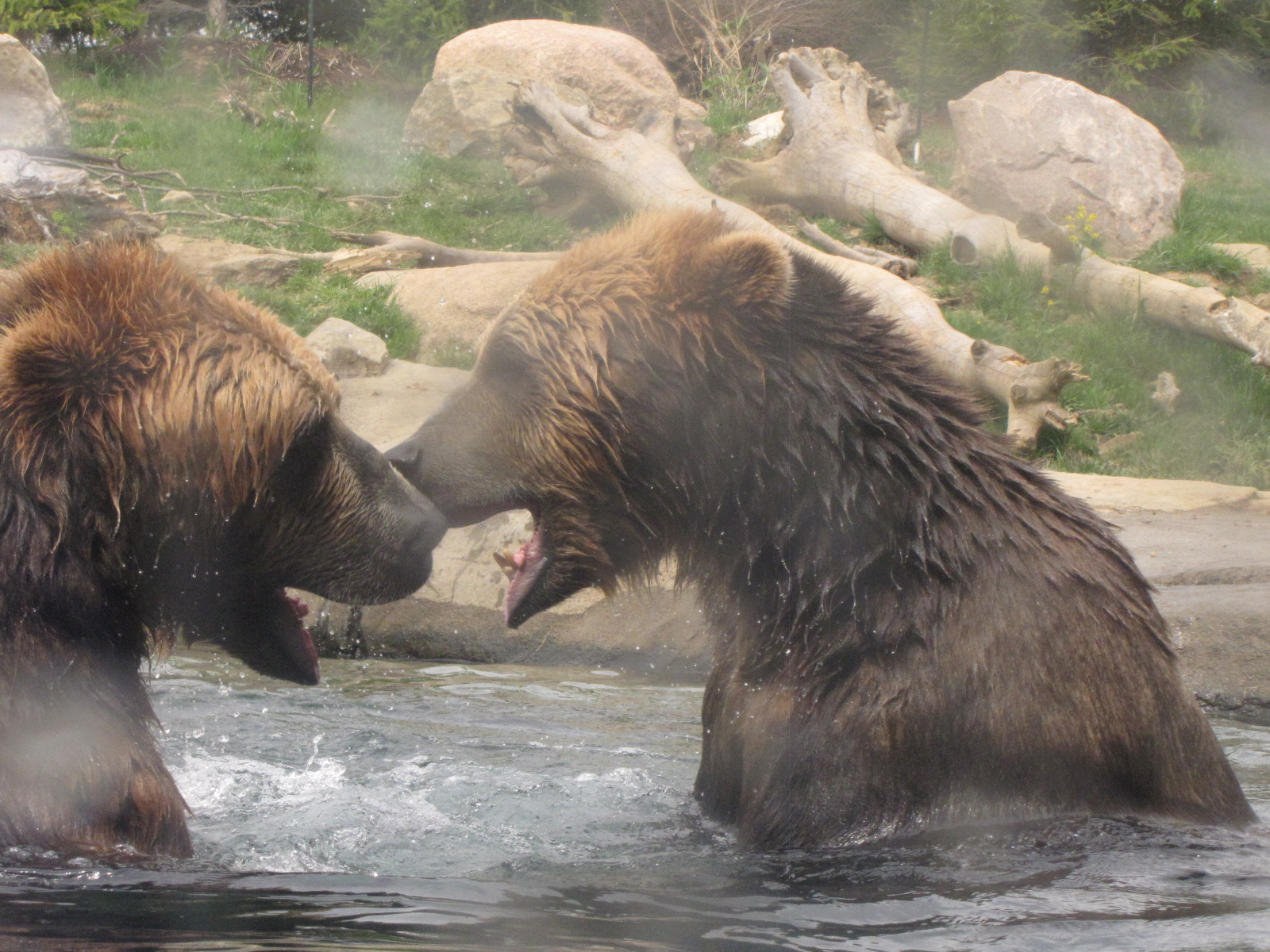A recent accomplishment for the Columbus Zoo is the opening, in May 2010, of their Polar Frontier exhibit. The star enclosure is the 1.3 acre yard with two pools, one being 167,000 gallons with an underwater viewing area for visitors, full of large rocks, lush grass, trees and dens, all for the zoos two polar bears. But for us the stars of this exhibit weren’t the polar bears who were relaxing on their hefty rocks overlooking their pool, it was their neighbours. Next to the polar bears was another large enclosure with a waterfall flowing into a huge pool, also with underwater viewing, surrounded by beautiful river rocks and home to Brutus and Buckeye. Who and what are Brutus and Buckeye? They’re Columbus Zoo’s brown bear brothers, these teenagers are massive animals weighing about 850lbs and standing 8 feet tall. At the time of our visit we were fortunate enough to be there for what seemed to obviously be play time. A crowd quickly materialized around the glass wall separating us from enormous strength pawed with delicate playfulness as Brutus and Buckeye rough housed in the water like typical teenagers. Standing mostly submerged in the water with only their giant heads and paws above, casually swatting the others opened mouth full of large teeth that appeared to be smiling for the endless camera flashes as the crowd watched on in awe.