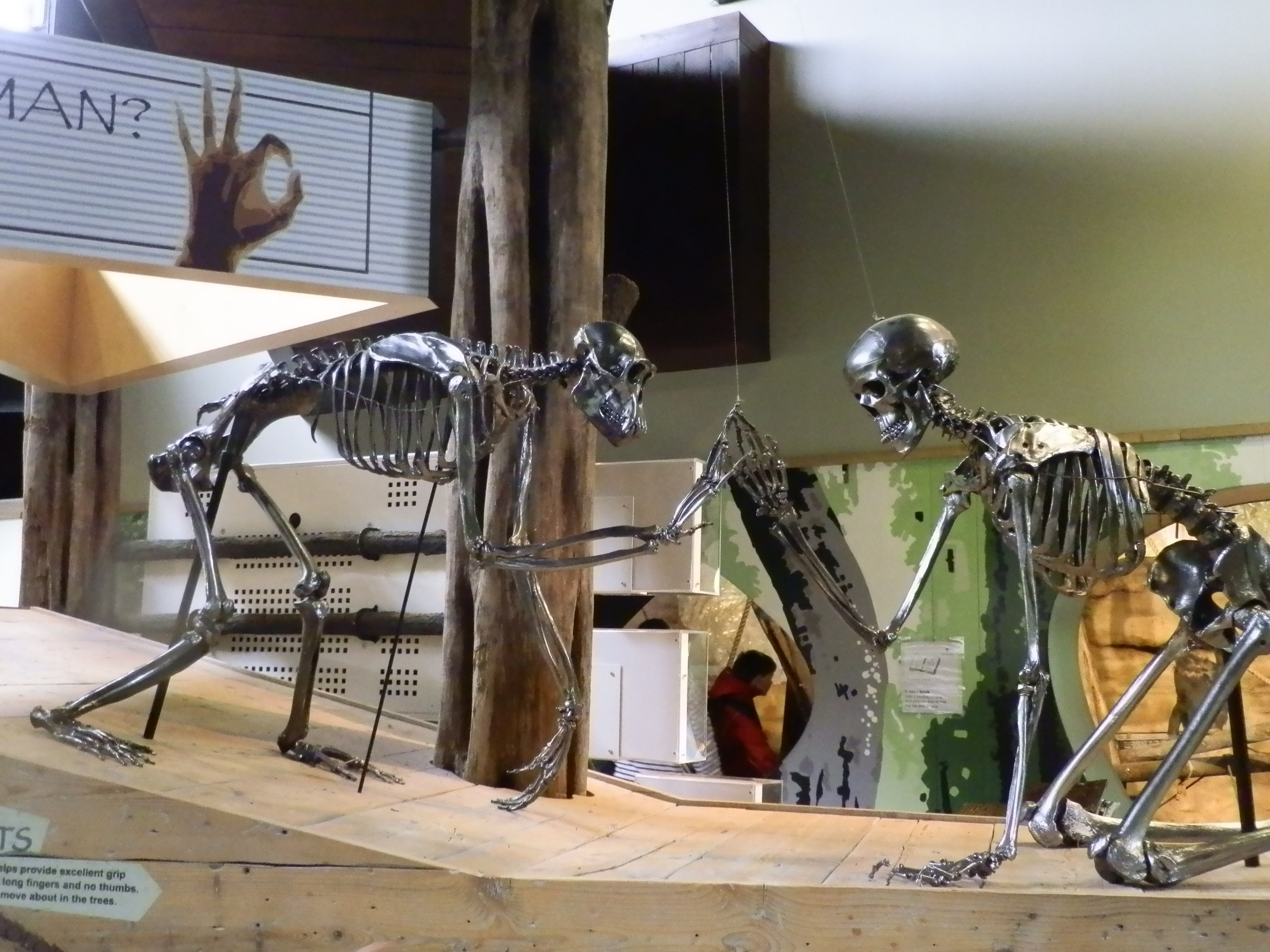 A cool feature about this exhibit is a glass tunnel that runs between both enclosures, right over visitors’ heads, where the chimps can travel between spaces or simply hang out in. Another great addition is an amazing statue that stands in the middle of the exhibit. This metal statue represents a skeleton of both a chimp and a man, both on all fours, like a mirrored image each reaching out to touch the other’s hand, is a moving and thought-provoking piece of art.