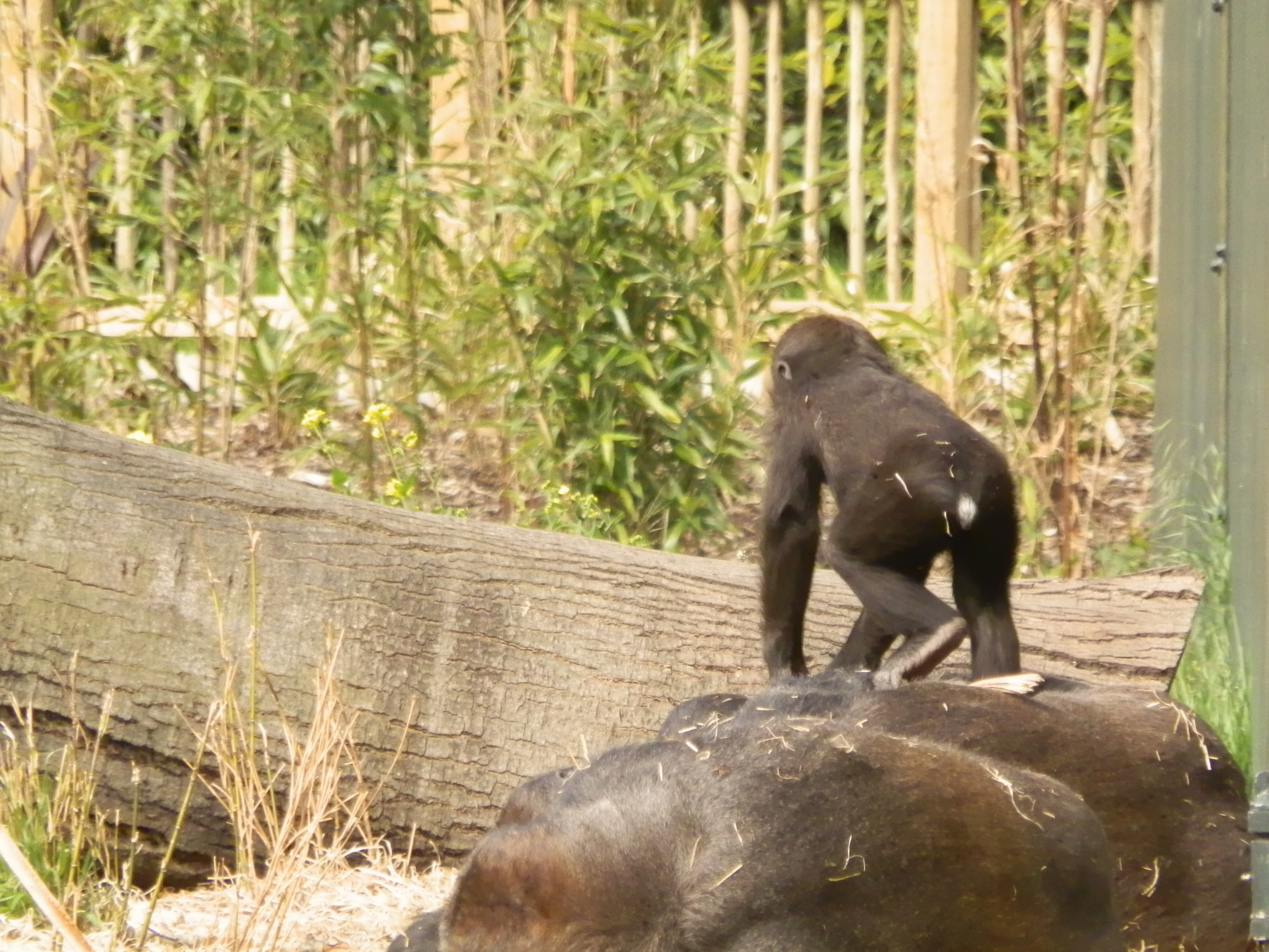 Much of the Dublin Zoo’s African Plains exhibit is composed of a string of man-made islands in their large natural lake. It’s on one of these large islands you’ll find the Gorilla Rainforest exhibit that includes not only a large, lush green island with various trees and climbing structures but also an indoor enclosure. Encompassing 12,000 square metres, the exhibit was inspired by the rainforests of western Africa that these gorillas call home. The zoo’s troop of 7 western lowland gorillas can be seen from a variety of viewpoints from inside to all around the island habitat. My first meeting was with the troop’s silverback who was dozing against the glass, but it was evident that he was aware of what was going on as he faced his troop that was further away on the island. I walked over to the other side of the island where I could see the rest of the troop. In the early afternoon sun the troop was sleeping, or at least trying to, all except the youngest.