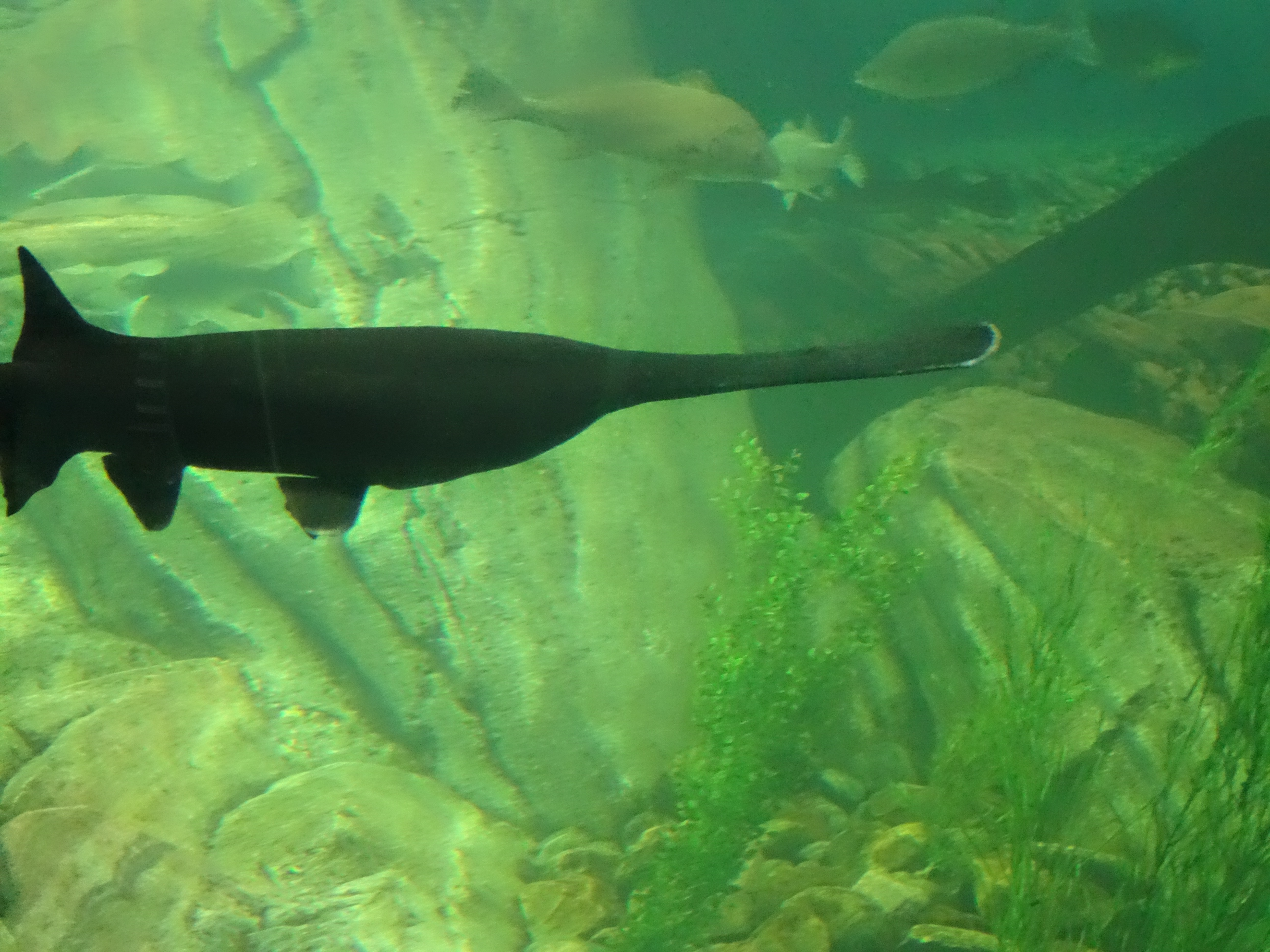 The Canadian Waters section houses 17 exhibits in over 665,000 litres of water, with the Great Lake Exhibit containing over 100,000 litres. After passing by the circular tank of a huge school of alewife fish you enter the Canadian Waters. Here you’ll meet creatures from the cold Atlantic waters to the Great Lakes and over to the Pacific. What will you encounter? You’ll see the paddlefish with its paddle-like snout, long slender body swimming with the lake sturgeon which is the largest freshwater fish in Canada and can grow up to two metres long and weigh 136 kg ( 300 lbs) – with the Canadian gold medal for oldest sturgeon going to an 154 year old.