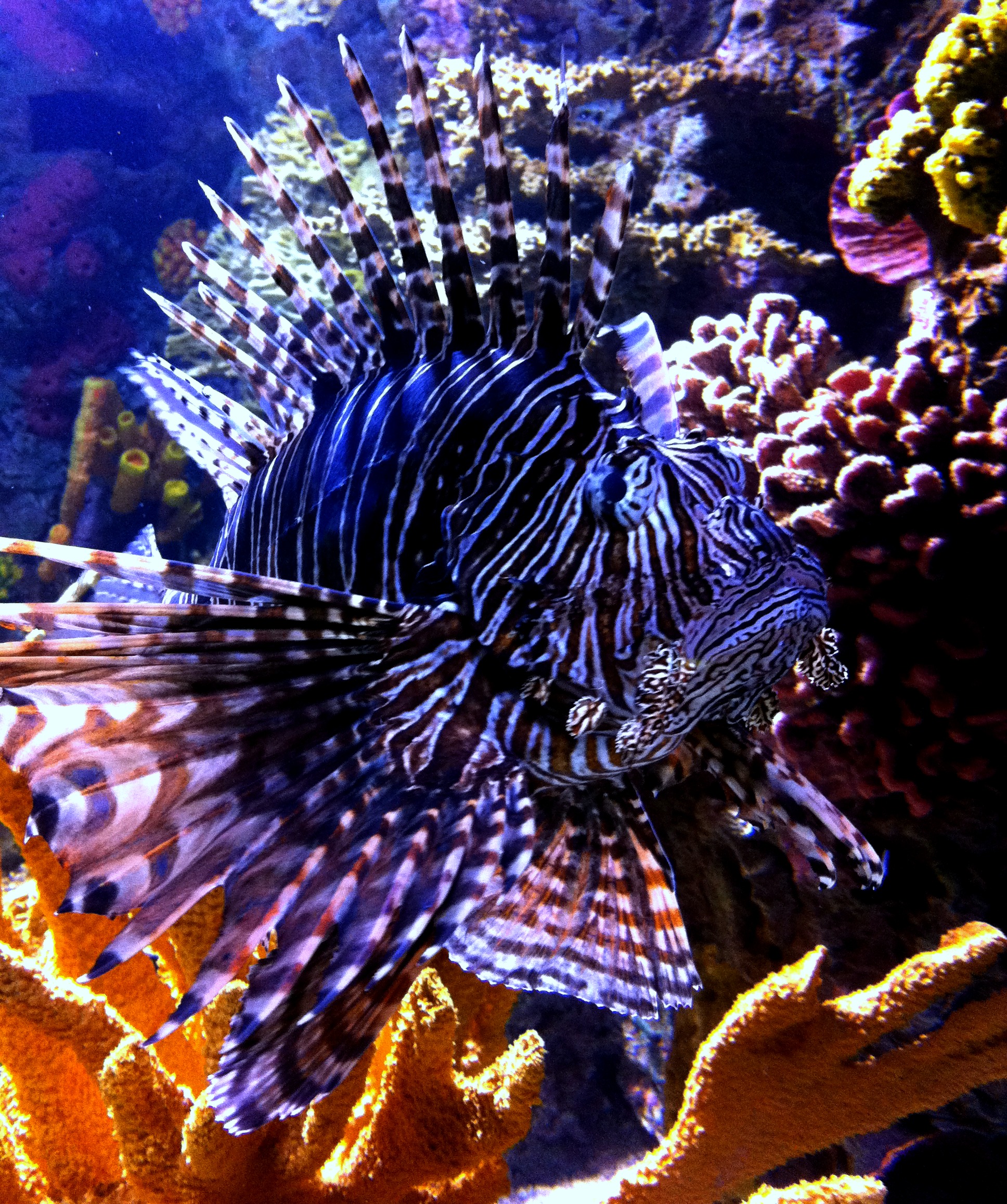 The Gallery features a variety of delicate species from around the world in 6 salt water and 3 fresh water exhibits totalling over 50,000 litres. The most striking fish you’ll find here is the red lionfish. These beautiful fish look like a work of art with their loads of delicate fins, red colouring and fierce look, but they are venomous. Native to the Indo-Pacific coral reef waters, red lionfish can grow up to 15″ in length and are a solitary species. Surprisingly even with their, up to 18″ long venomous needle-like dorsal fins, they are a popular menu item.