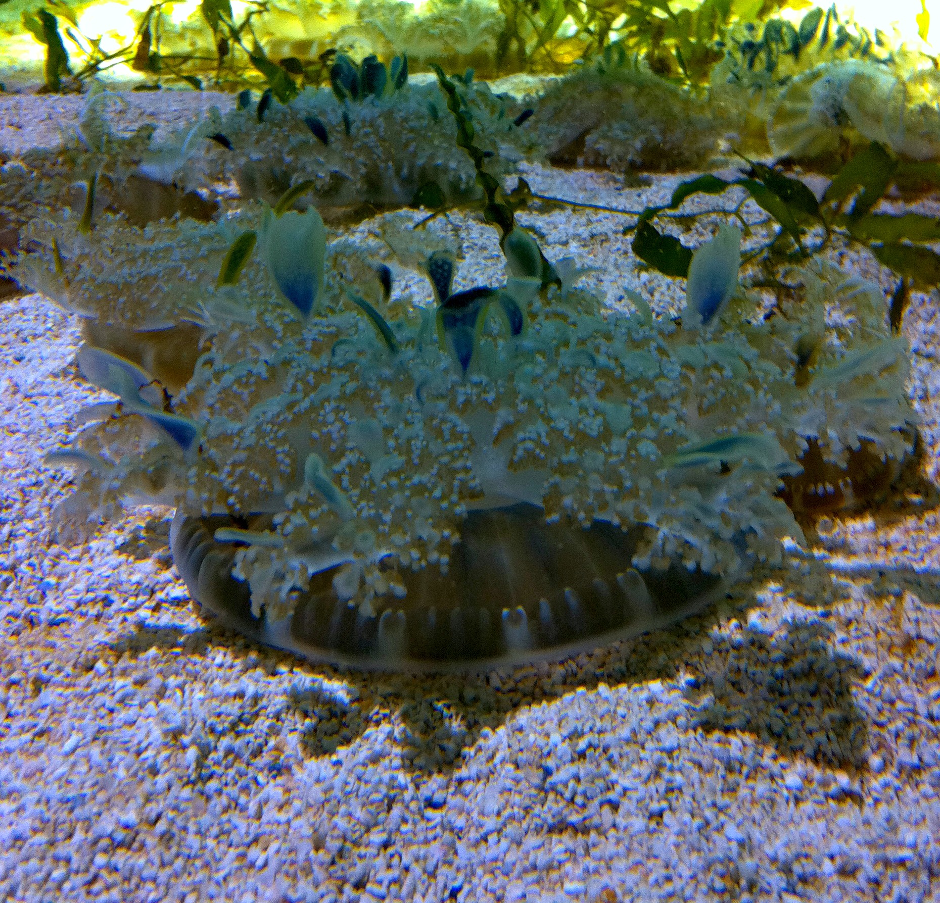 The aquarium is home to a variety of jellyfish from the cute little Australian spotted jelly to one I’d never seen before – the upside down jelly. The upside down jellyfish lives on the bottom of the ocean floor in shallow waters where it uses its bell to suction cup to the bottom. Funny enough, sometimes crabs pick them up and carry them stuck on their own backs to help protect themselves from predators. I found them quite pretty, looking almost like flowers.