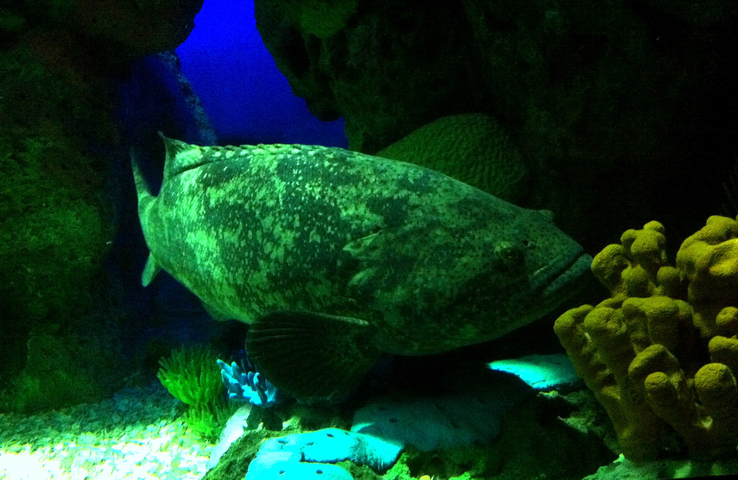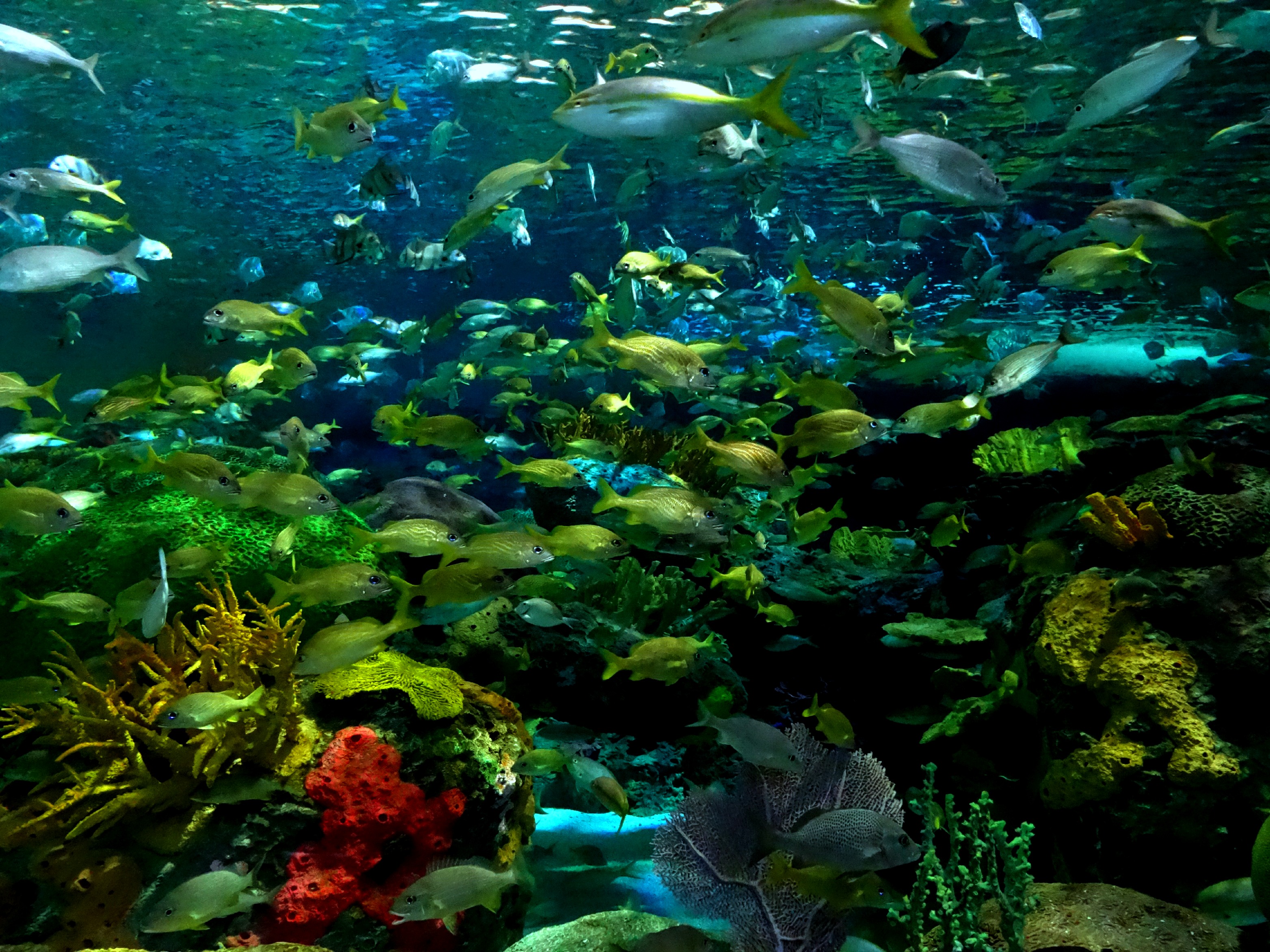 You’ll be immediately drawn into this exhibit, surrounded by large sharks, large fish, smaller schools of fish and all in an underwater experience with no snorkel or diving gear necessary. Surprisingly one of the first fish that caught my eye was the tarpon. The tarpon is a long, slender fish at 4 to 8 feet long and weighing 60 to 280 pounds. These very adaptable fish also take gulps of air from the surface which gives them a short burst of energy. Among the schools of yellowtail snapper and porkfish are moray eels lurking in crevices as well as an illusive green sea turtle who I sadly didn’t see on my visit. Green sea turtles are endangered and at up to 5′ (1.5m) in length and weighing up to 700lbs (317.5kg) they can live over 80 years. Like other sea turtles they can’t pull their head into their shell but unlike the others it is the only sea turtle that is a herbivore.