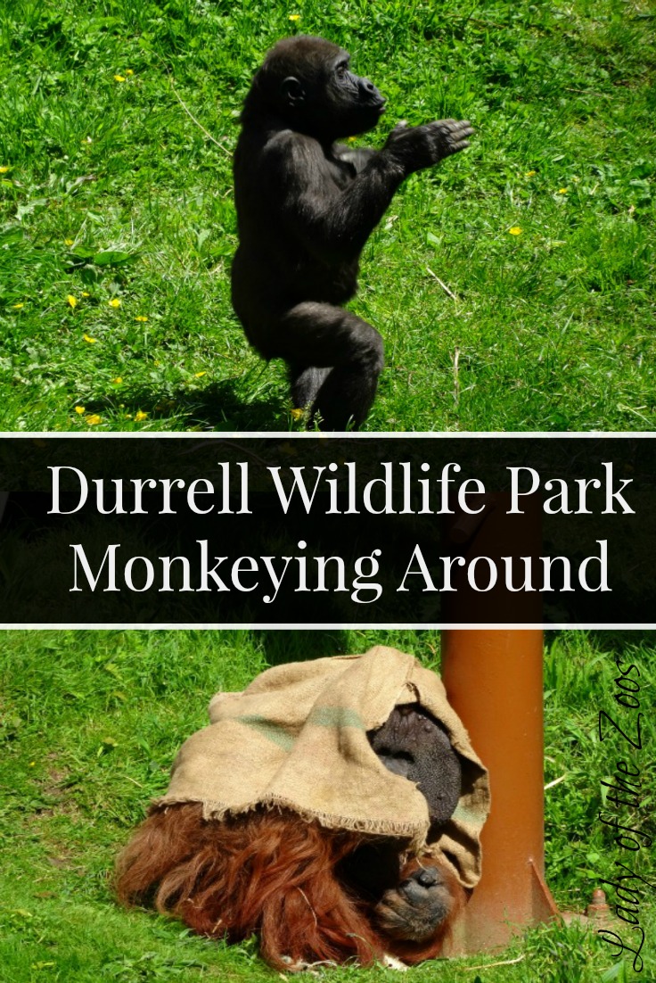 The first of the great apes that you’ll encounter is the Park’s troop of western lowland gorillas. As I drew near I breathed in that fragrant aroma that is gorilla and smiled. Yes, I will publicly admit it here and now, I love the smell of gorillas, I don’t know why but perhaps I associated it with my love for them. At the Durrell Wildlife Park the gorillas have indoor and a huge outdoor enclosure. Their outdoor yard had a face lift last year (2014), thanks to the help of the Jersey Field Squadron who volunteered their time to help the Durrell staff and the Senior Ape Keeper to create a 3D enclosure with a fantastic jungle-gym of ropes, wooden platforms and thick netting, for the gorillas to climb, seek shelter and help enrich their days. If there is one animal at zoos that I can sit and watch all day it is gorillas, always so human like with their expressions and interest in things and of course when there is a youngster around there is always entertainment. The Park’s youngest, Indigo, is quite the ham, full of gusto and always having a good time. I sat and watched as he tumbled down the hillside, only to come back up and do it again and later, with an eye on dad, he stood on his hind legs and tottered a distance trying to look big and half-heartedly beating his chest, preparing for his days as a silverback I guess.