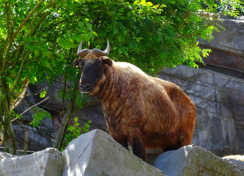 I’m always in awe of takins. Takins are a large goat/antelope species that are found in the eastern Himalayas. Their golden coat and relaxed nature always draw me in. While they’re usually lounging in the shade when I see them in zoos I was excited to see them up, active and exploring their exhibit at the Antwerp Zoo. Their exhibit was large and multi-leveled, and simulated their native habitat.